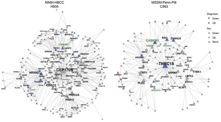 While schizophrenia differs between males and females in the age of onset, symptomatology, and disease course, the molecular mechanisms underlying these differences remain uncharacterized. To address questions about the sex-specific effects of schizophrenia, we performed a large-scale transcriptome analysis of RNA sequencing data from 437 controls and 341 cases from two distinct cohorts from the CommonMind Consortium. Analysis across the cohorts identified a reproducible gene expression signature of schizophrenia that was highly concordant with previous work. Differential expression across sex was reproducible across cohorts and identified X- and Y-linked genes, as well as those involved in dosage compensation. Intriguingly, the sex expression signature was also enriched for genes involved in neurexin family protein binding and synaptic organization. Differential expression analysis testing a sex-by-diagnosis interaction effect did not identify any genome-wide signature after multiple testing corrections. Gene coexpression network analysis was performed to reduce dimensionality from thousands of genes to dozens of modules and elucidate interactions among genes. We found enrichment of coexpression modules for sex-by-diagnosis differential expression signatures, which were highly reproducible across the two cohorts and involved a number of diverse pathways, including neural nucleus development, neuron projection morphogenesis, and regulation of neural precursor cell proliferation. Overall, our results indicate that the effect size of sex differences in schizophrenia gene expression signatures is small and underscore the challenge of identifying robust sex-by-diagnosis signatures, which will require future analyses in larger cohorts.