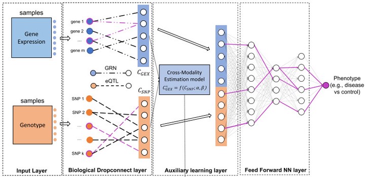 Background - Genotypes are strongly associated with disease phenotypes, particularly in brain disorders. However, the molecular and cellular mechanisms behind this association remain elusive. With emerging multimodal data for these mechanisms, machine learning methods can be applied for phenotype prediction at different scales, but due to the black-box nature of machine learning, integrating these modalities and interpreting biological mechanisms can be challenging. Additionally, the partial availability of these multimodal data presents a challenge in developing these predictive models. Method - To address these challenges, we developed DeepGAMI, an interpretable neural network model to improve genotype-phenotype prediction from multimodal data. DeepGAMI leverages functional genomic information, such as eQTLs and gene regulation, to guide neural network connections. Additionally, it includes an auxiliary learning layer for cross-modal imputation allowing the imputation of latent features of missing modalities and thus predicting phenotypes from a single modality. Finally, DeepGAMI uses integrated gradient to prioritize multimodal features for various phenotypes. Results - We applied DeepGAMI to several multimodal datasets including genotype and bulk and cell-type gene expression data in brain diseases, and gene expression and electrophysiology data of mouse neuronal cells. Using cross-validation and independent validation, DeepGAMI outperformed existing methods for classifying disease types, and cellular and clinical phenotypes, even using single modalities (e.g., AUC score of 0.79 for Schizophrenia and 0.73 for cognitive impairment in Alzheimer’s disease). Conclusion - We demonstrated that DeepGAMI improves phenotype prediction and prioritizes phenotypic features and networks in multiple multimodal datasets in complex brains and brain diseases. Also, it prioritized disease-associated variants, genes, and regulatory networks linked to different phenotypes, providing novel insights into the interpretation of gene regulatory mechanisms. DeepGAMI is open-source and available for general use.