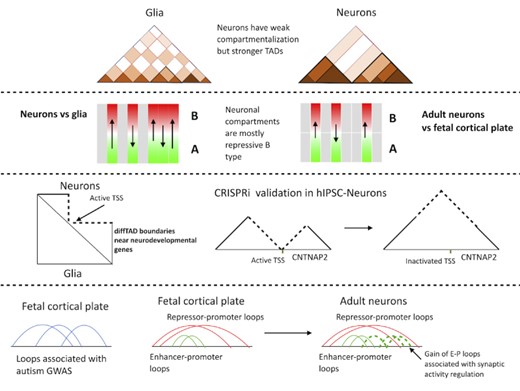 The human brain is a complex organ comprised of distinct cell types, and the contribution of the 3D genome to lineage specific gene expression remains poorly understood. To decipher cell type specific genome architecture, and characterize fine scale changes in the chromatin interactome across neural development, we compared the 3D genome of the human fetal cortical plate to that of neurons and glia isolated from the adult prefrontal cortex. We found that neurons have weaker genome compartmentalization compared to glia, but stronger TADs, which emerge during fetal development. Furthermore, relative to glia, the neuronal genome shifts more strongly towards repressive compartments. Neurons have differential TAD boundaries that are proximal to active promoters involved in neurodevelopmental processes. CRISPRi on CNTNAP2 in hIPSC-derived neurons reveals that transcriptional inactivation correlates with loss of insulation at the differential boundary. Finally, re-wiring of chromatin loops during neural development is associated with transcriptional and functional changes. Importantly, differential loops in the fetal cortex are associated with autism GWAS loci, suggesting a neuropsychiatric disease mechanism affecting the chromatin interactome. Furthermore, neural development involves gaining enhancer-promoter loops that upregulate genes that control synaptic activity. Altogether, our study provides multi-scale insights on the 3D genome in the human brain.