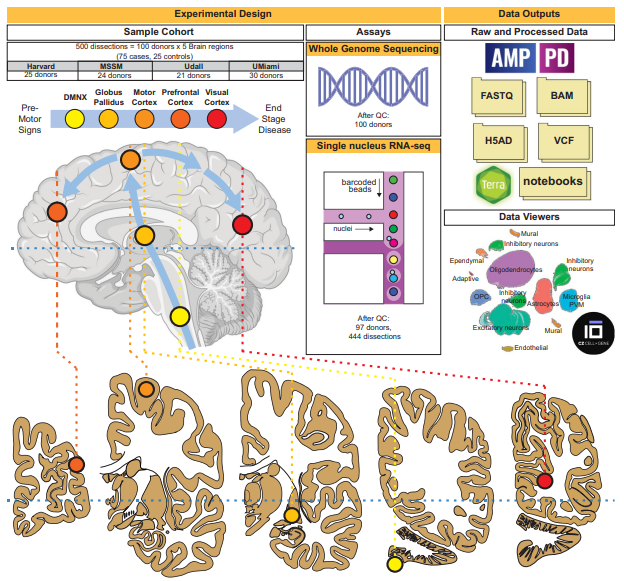 Parkinson’s Disease (PD) is a debilitating neurodegenerative disorder, characterized by motor and cognitive impairments, that affects >1% of the population over the age of 60. The pathogenesis of PD is complex and remains largely unknown. Due to the cellular heterogeneity of the human brain and changes in cell type composition with disease progression, this complexity cannot be fully captured with bulk tissue studies. To address this, we generated single-nucleus RNA sequencing and whole-genome sequencing data from 100 postmortem cases and controls, carefully selected to represent the entire spectrum of PD neuropathological severity and diverse clinical symptoms. The single nucleus data were generated from five brain regions, capturing the subcortical and cortical spread of PD pathology. Rigorous preprocessing and quality control were applied to ensure data reliability. Committed to collaborative research and open science, this dataset is available on the AMP PD Knowledge Platform, offering researchers a valuable tool to explore the molecular bases of PD and accelerate advances in understanding and treating the disease.