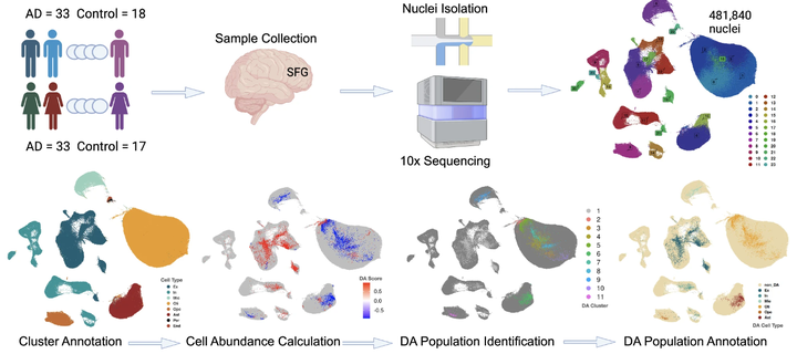 The emergence of single nucleus RNA sequencing (snRNA-seq) offers to revolutionize the study of Alzheimer’s disease (AD). Integration with complementary multiomics data such as genetics, proteomics and clinical data provides powerful opportunities to link cell subpopulations and molecular networks with a broader disease-relevant context. We report snRNA-seq profiles from superior frontal gyrus samples from 101 well characterized subjects from the Banner Brain and Body Donation Program in combination with whole genome sequences. We report findings that link common AD risk variants with CR1 expression in oligodendrocytes as well as alterations in hematological parameters. We observed an AD-associated CD83(+) microglial subtype with unique molecular networks and which is associated with immunoglobulin IgG4 production in the transverse colon. Our major observations were replicated in two additional, independent snRNA-seq data sets. These findings illustrate the power of multi-tissue molecular profiling to contextualize snRNA-seq brain transcriptomics and reveal disease biology.