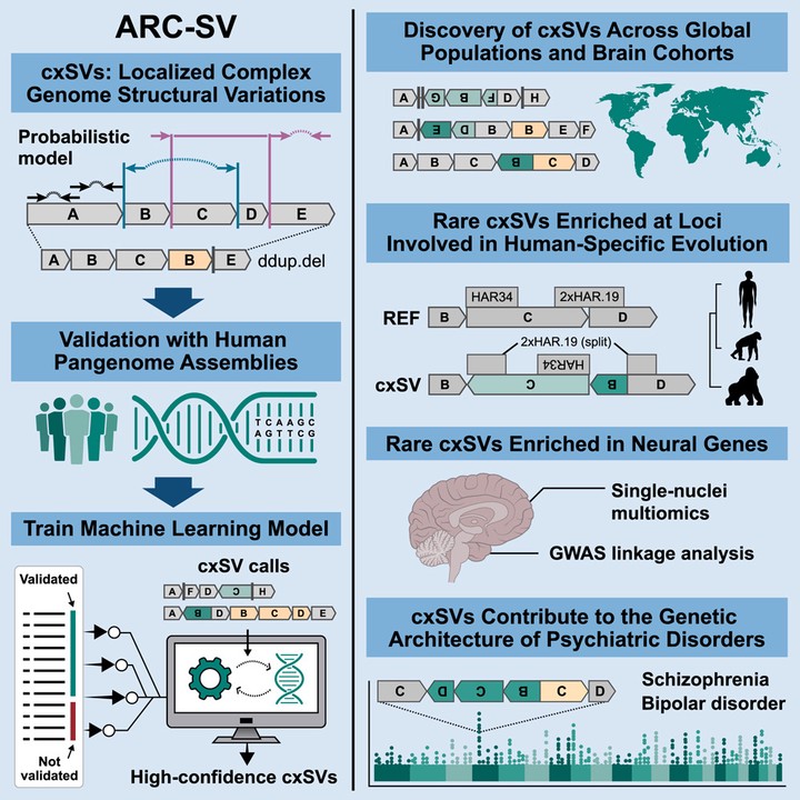 Complex structural variations (cxSVs) are often overlooked in genome analyses due to detection challenges. We developed ARC-SV, a probabilistic and machine-learning-based method that enables accurate detection and reconstruction of cxSVs from standard datasets. By applying ARC-SV across 4,262 genomes representing all continental populations, we identified cxSVs as a significant source of natural human genetic variation. Rare cxSVs have a propensity to occur in neural genes and loci that underwent rapid human-specific evolution, including those regulating corticogenesis. By performing single-nucleus multiomics in postmortem brains, we discovered cxSVs associated with differential gene expression and chromatin accessibility across various brain regions and cell types. Additionally, cxSVs detected in brains of psychiatric cases are enriched for linkage with psychiatric GWAS risk alleles detected in the same brains. Furthermore, our analysis revealed significantly decreased brain-region- and cell-type-specific expression of cxSV genes, specifically for psychiatric cases, implicating cxSVs in the molecular etiology of major neuropsychiatric disorders.