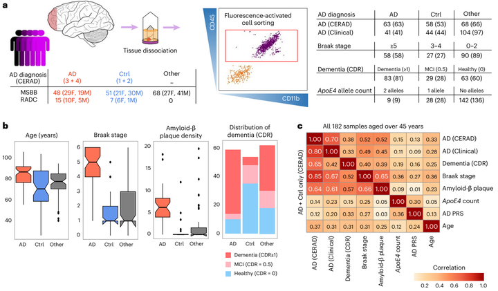 Microglia are resident immune cells of the brain and are implicated in the etiology of Alzheimer’s disease (AD) and other diseases. Yet the cellular and molecular processes regulating their function throughout the course of the disease are poorly understood. Here, we present a transcriptional analysis of primary microglia from 189 human postmortem brains, including 58 healthy aging individuals and 131 with a range of disease phenotypes, such as 63 patients representing the full clinical and pathological spectra of AD. We identified changes associated with multiple AD phenotypes, capturing the severity of dementia and neuropathological lesions. Transcript-level analyses identified additional genes with heterogeneous isoform usage and AD phenotypes. We identified changes in gene–gene coordination in AD, dysregulation of coexpression modules and disease subtypes with distinct gene expression patterns. Taken together, these data further our understanding of the key role that microglia have in AD biology and nominate candidates for therapeutic intervention.
