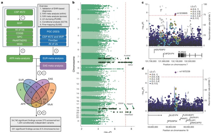 Schizophrenia and related psychoses occur in all human populations, with the highest rates of diagnosis among Black individuals and those of mainly African ancestry. Decades of research have established a highly heritable and polygenic basis for schizophrenia, which is mostly shared across populations. However, a recruitment bias towards European cohorts5 has led to discoveries that are poorly generalizable to African populations. This exclusion of the world’s most genetically diverse populations narrows our understanding of disease biology and risks exacerbating health disparities. Here we show that electronic health records linked with genomic data from the Million Veteran Program (MVP)-a national research programme that looks at the effects of genes, lifestyle, military experiences and exposures on the health and wellness of veterans-enable a comprehensive assessment of schizophrenia genetics in populations of African ancestry in the USA. We identify ancestry-independent associations in African populations and expand the catalogue of implicated regions by more than 100 loci. Through statistical fine-mapping and integrative transcriptomic analyses, we refine disease-associated signals to consensus genes with convergent neurobiological functions. These findings provide a much-needed view of schizophrenia’s genetic architecture in populations of African ancestry, and offer biological insights that both extend previous work and broaden its global relevance.